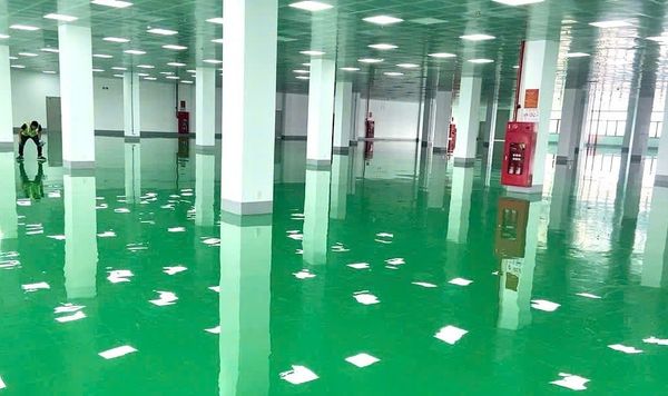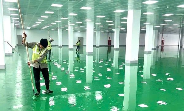 - Xử lý bề mặt bê tông: Bề mặt sàn được mài phẳng bằng máy mài chuyên dụng, hút sạch bụi và loại bỏ tạp chất để đảm bảo độ bám dính tối ưu cho lớp sơn.